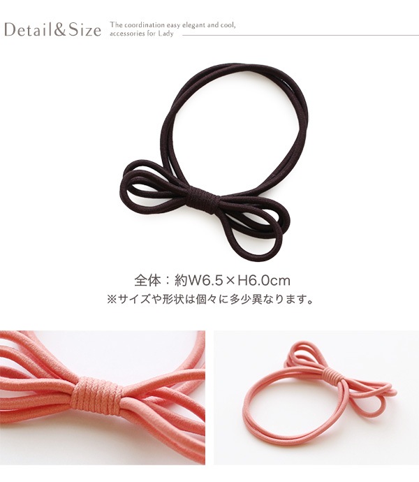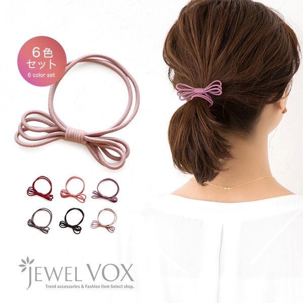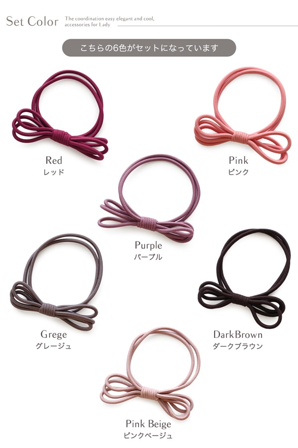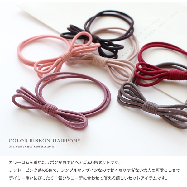 カラーゴムを重ねたリボンが可愛いヘアゴム6色セットです。