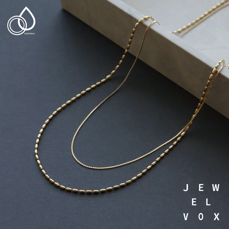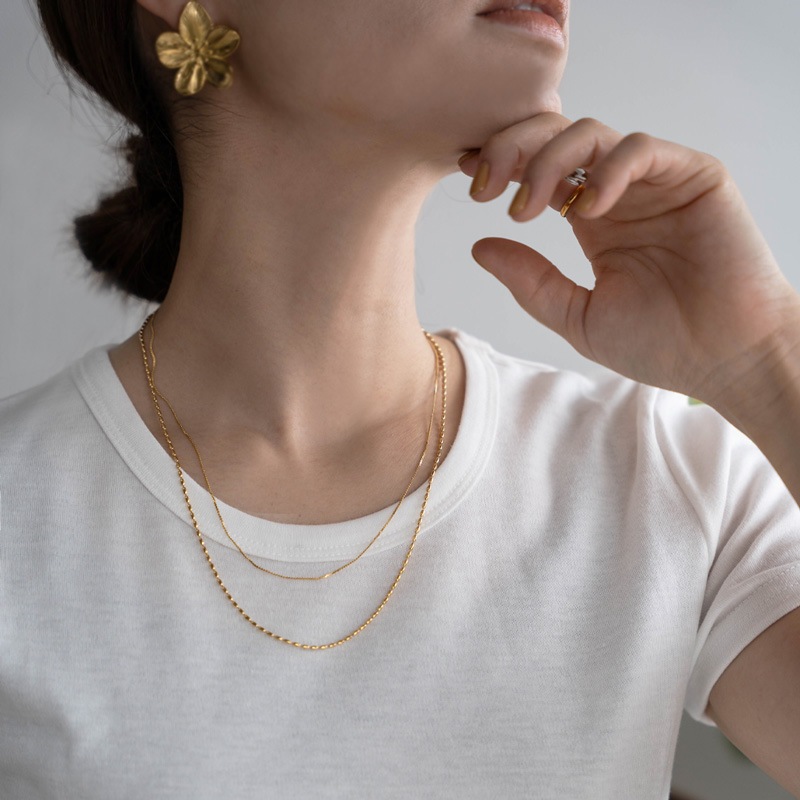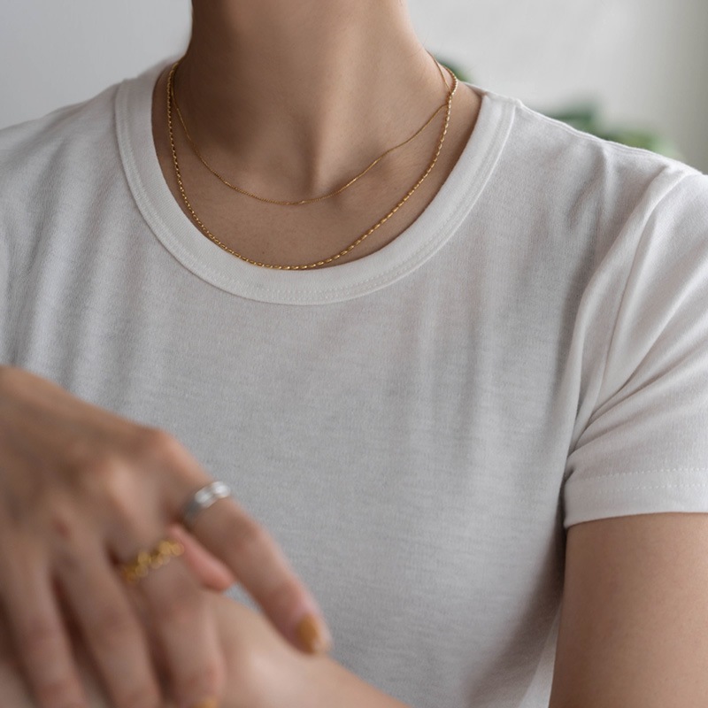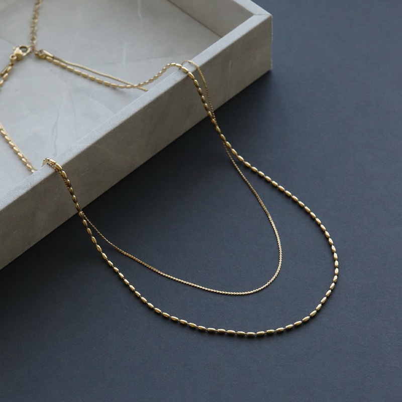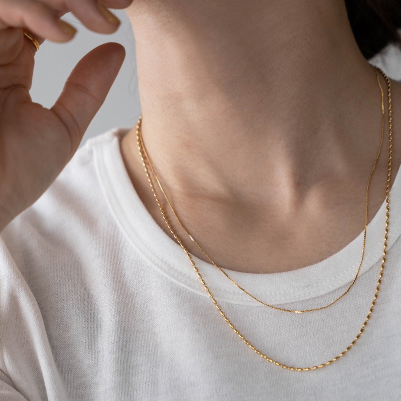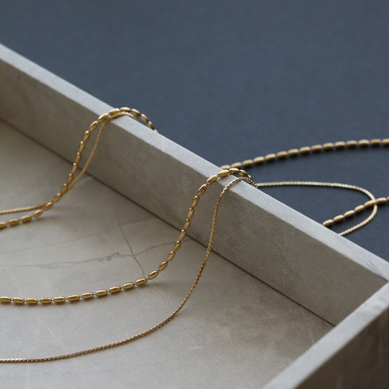 華奢なスネークチェーンとぷっくりとしたフォルムがかわいいライス型チェーンを合わせた2連デザイン。