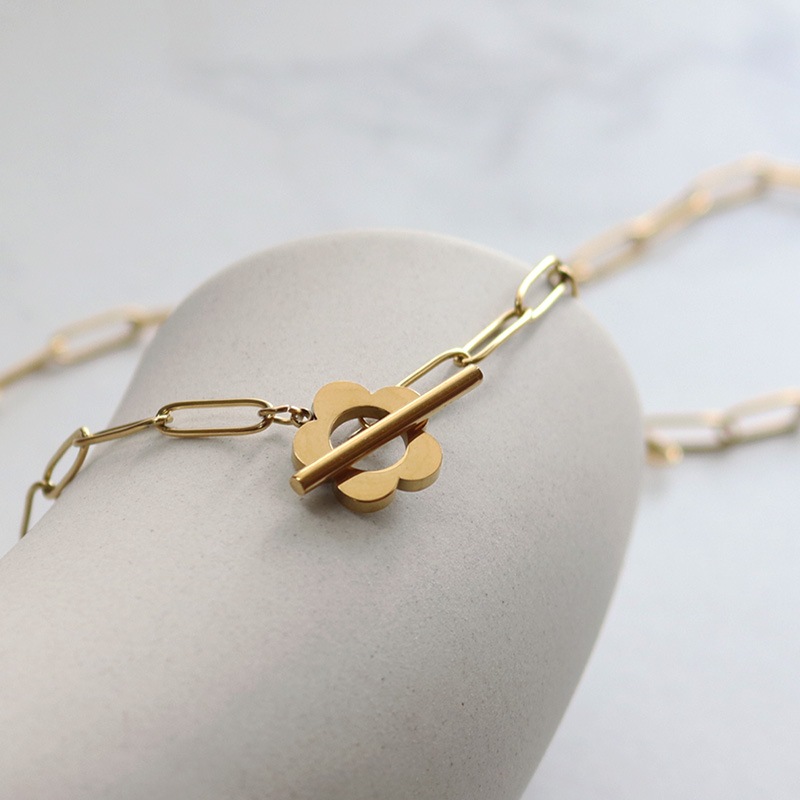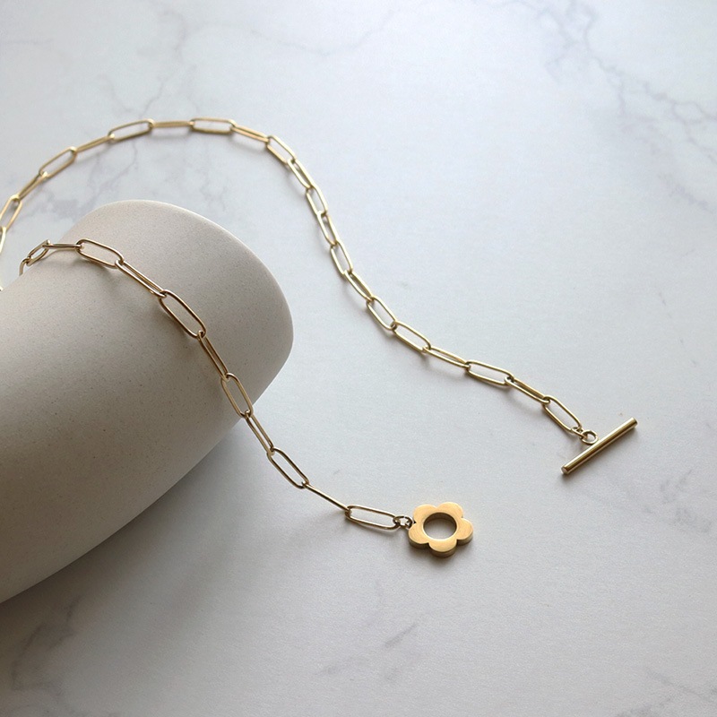 縦長のコマを連ねた抜け感のあるチェーンにフラワーモチーフのマンテル(留め具)を合わせたデザイン。