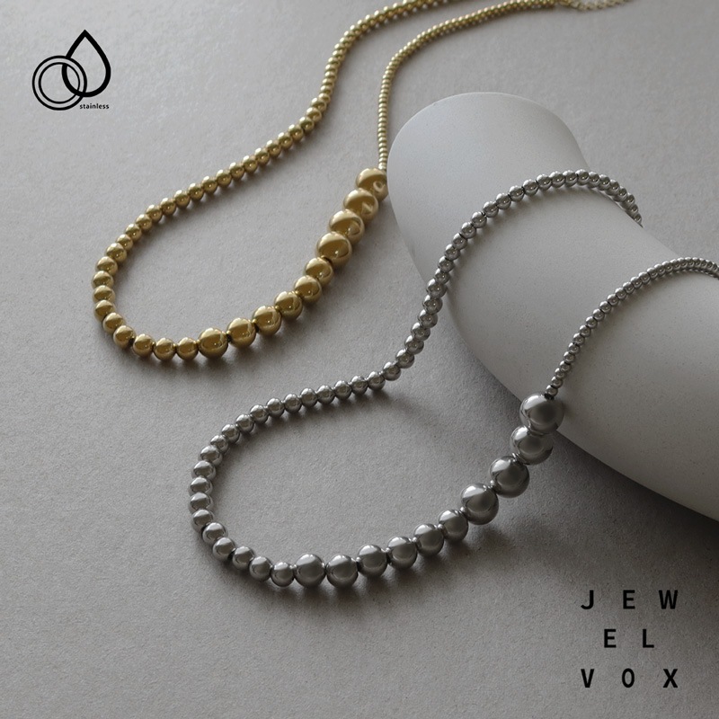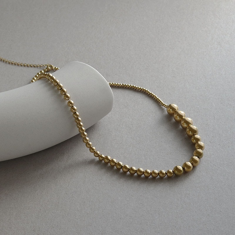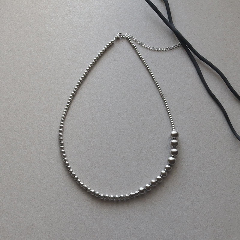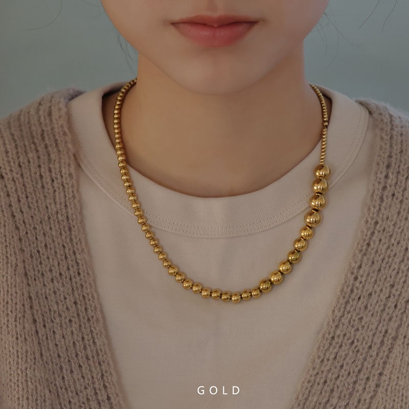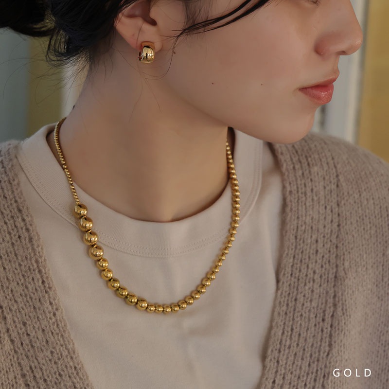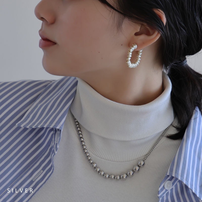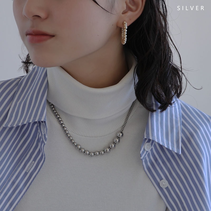 大きさの異なるメタルボールを連ねたグラデーションが立体感を生み、コーデを引き立てるリッチなデザイン。