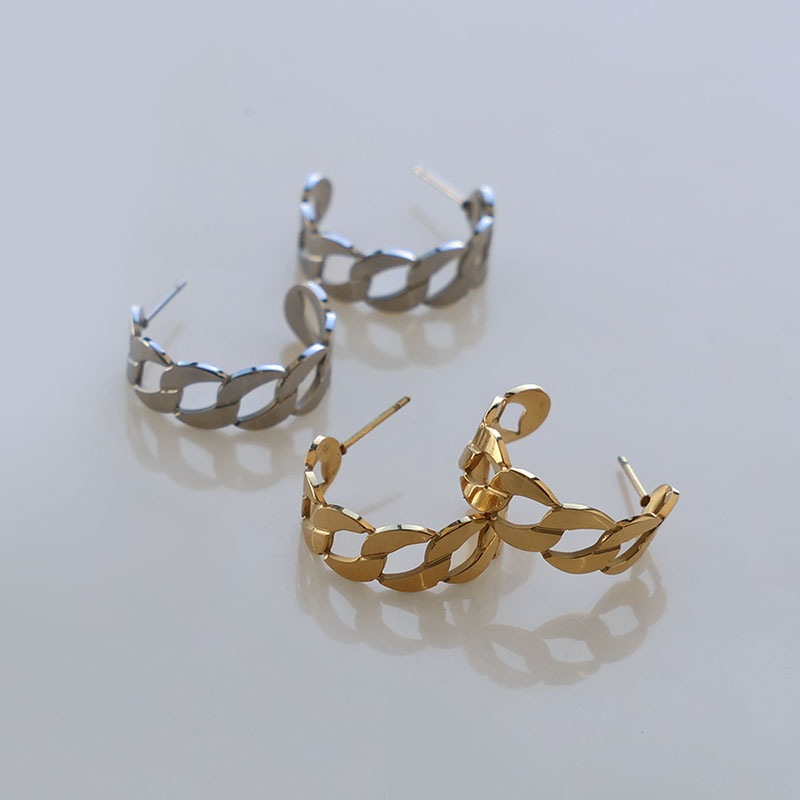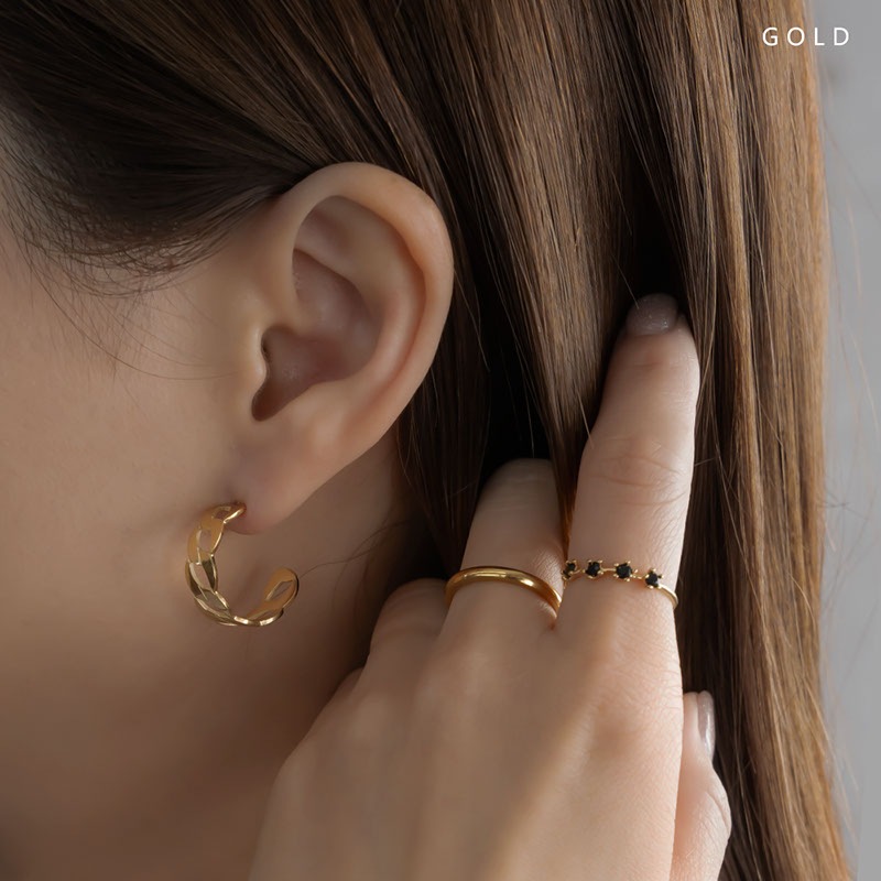 チェーン風の透かしハーフフープがカジュアルにもきれいめにも合わせやすいデザイン。