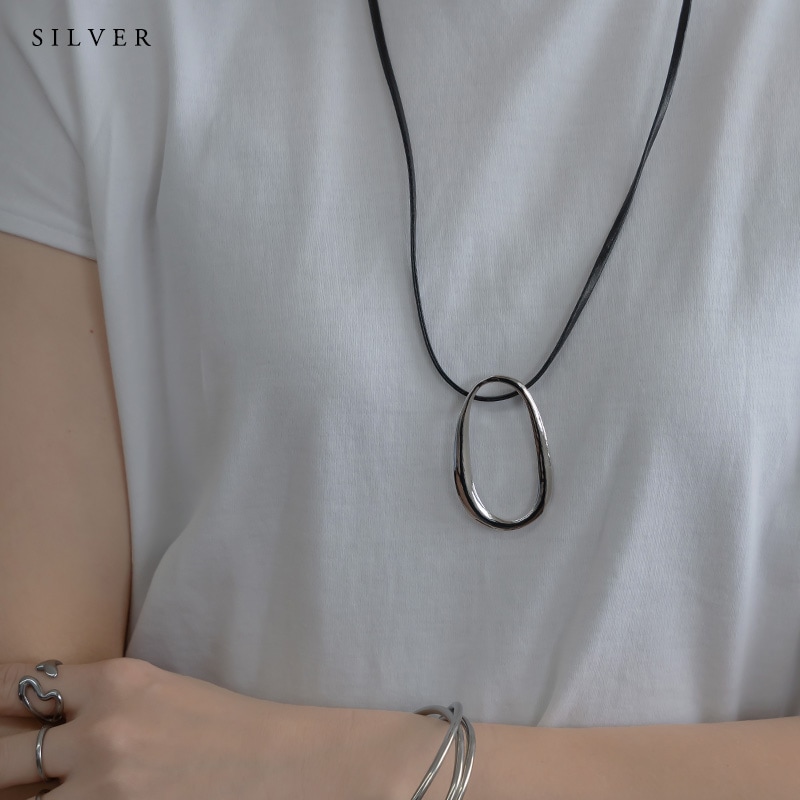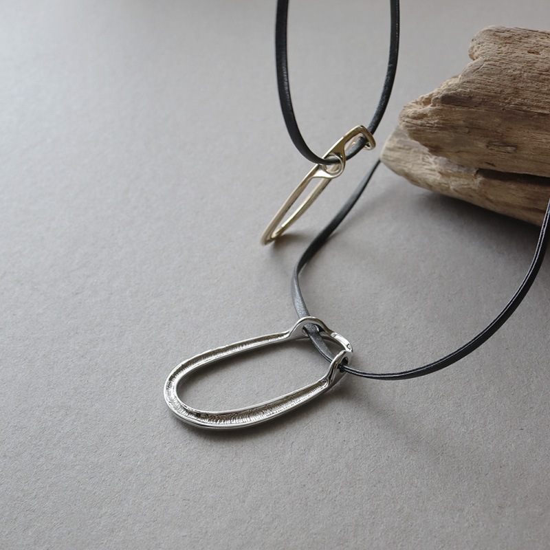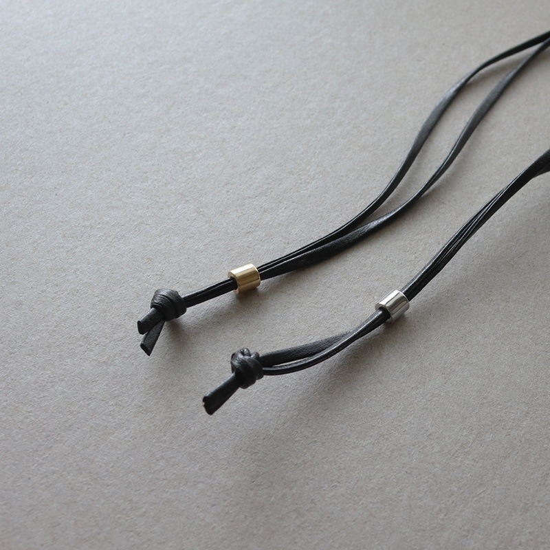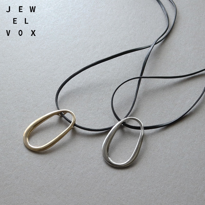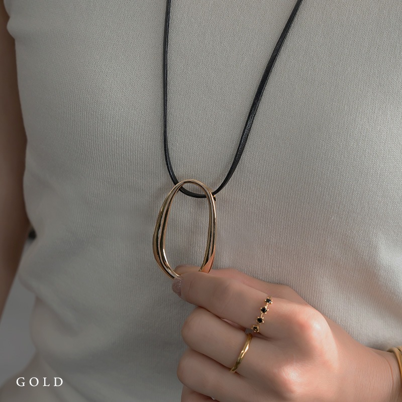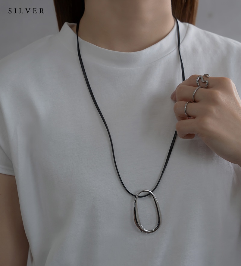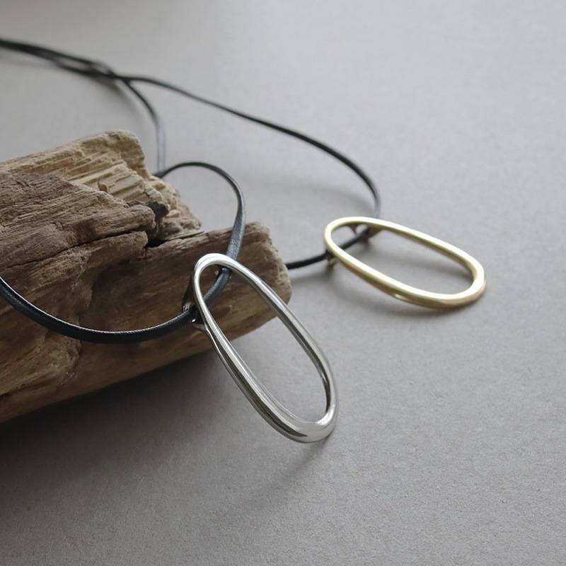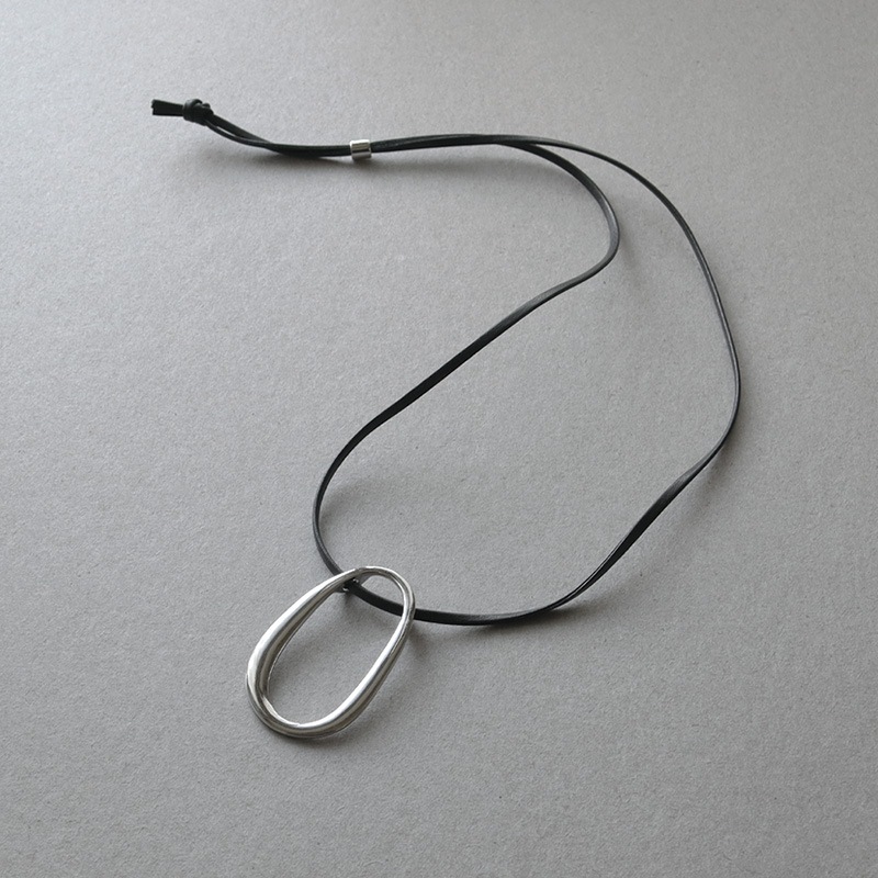 - 艶やかなメタルの楕円モチーフにレザーコードを合わせたネックレスです。