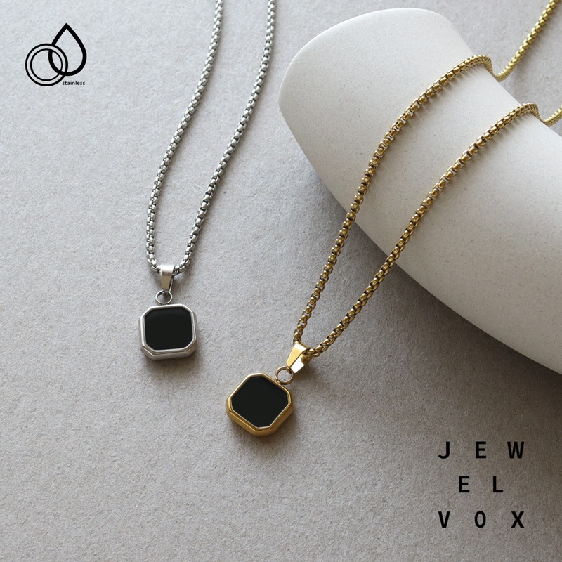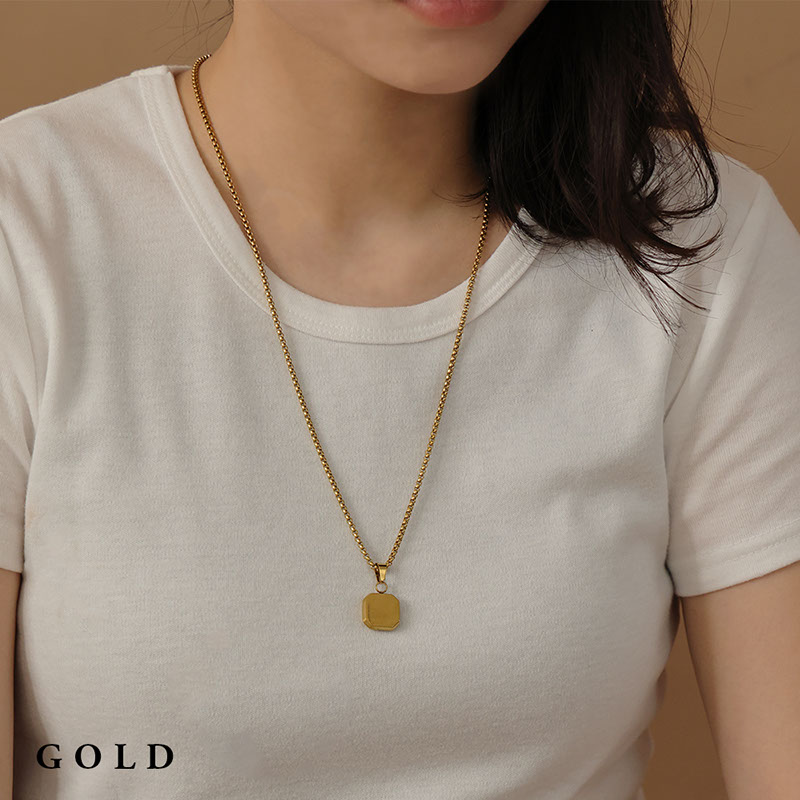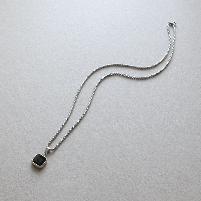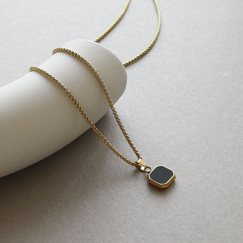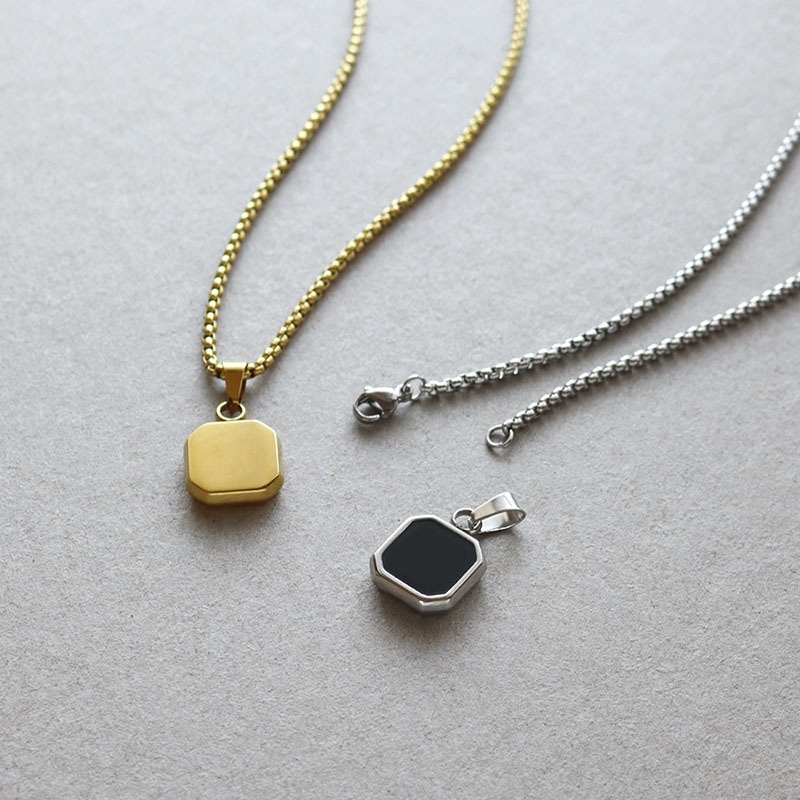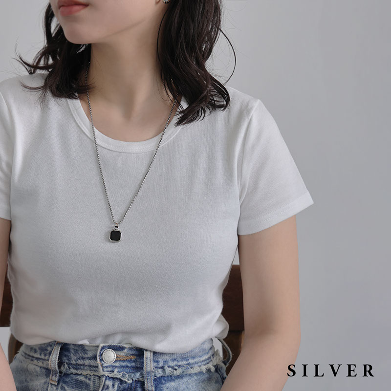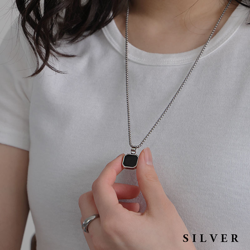 クールな甲丸チェーンにブラックプレートを埋め込んだスクエア型チャームを合わせたモードなデザイン。