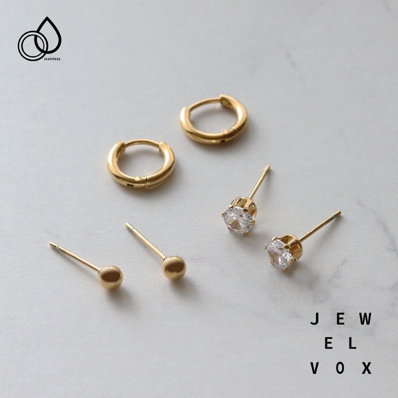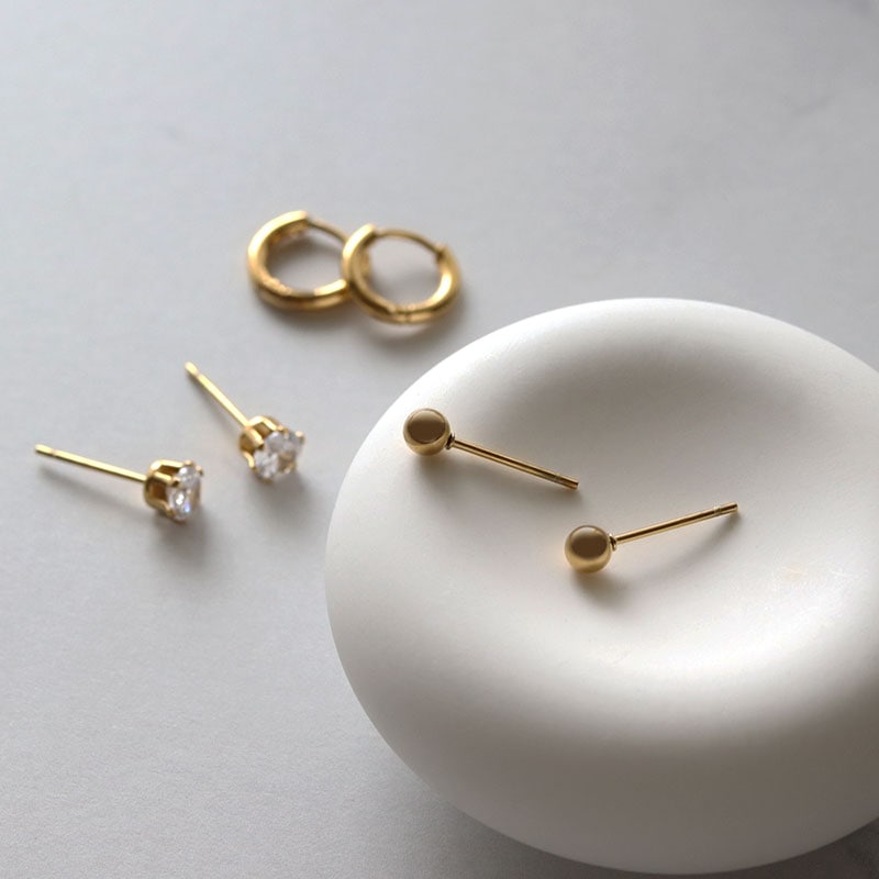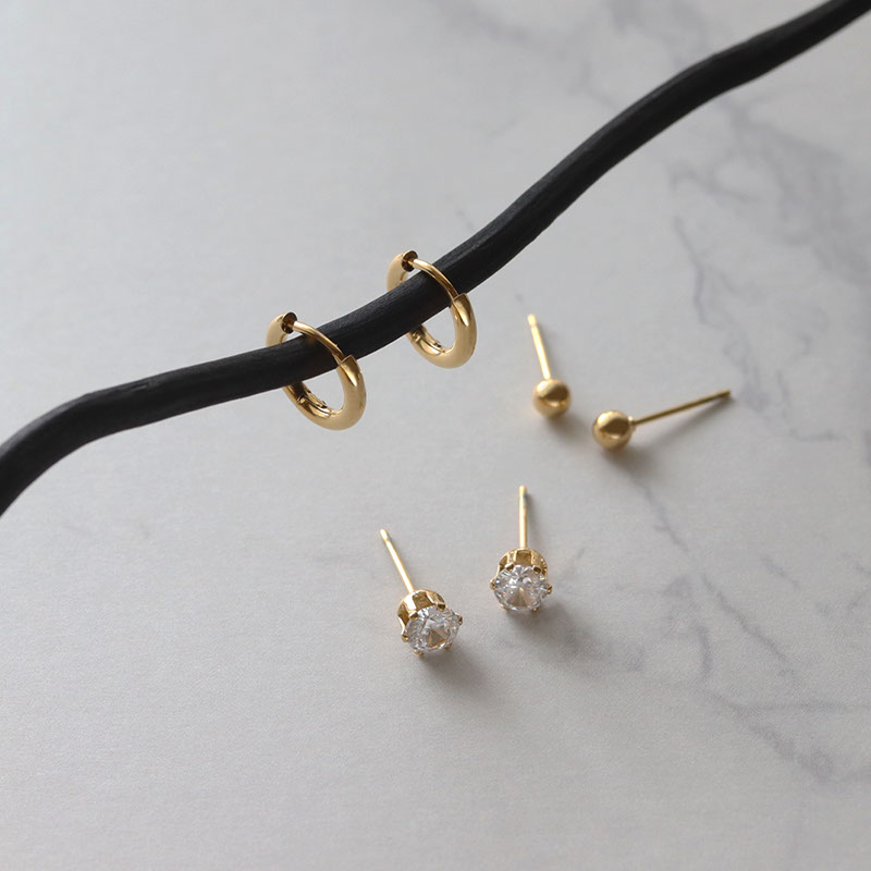 シンプルで使いやすい、一粒ストーン、メタルボール、フープピアスの3種セット。