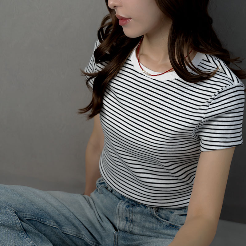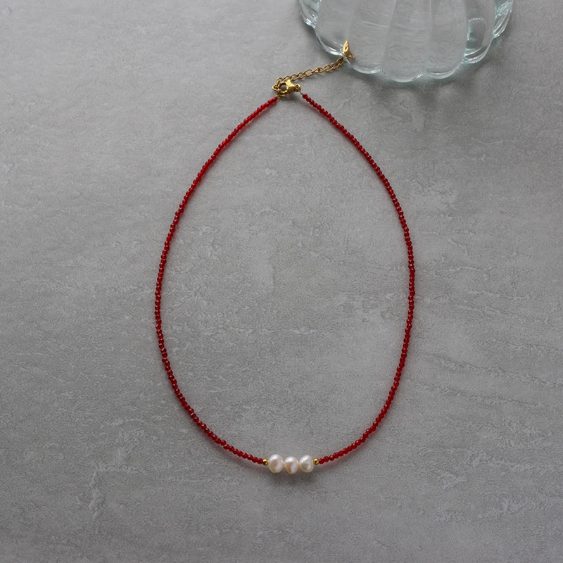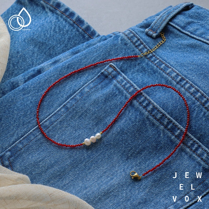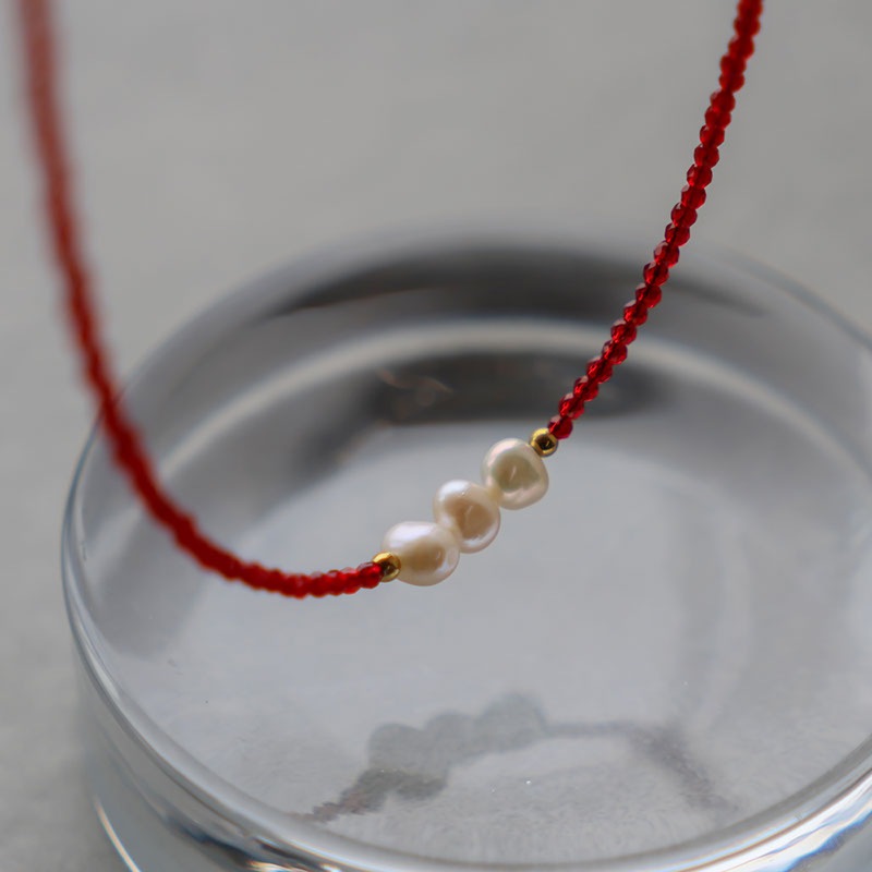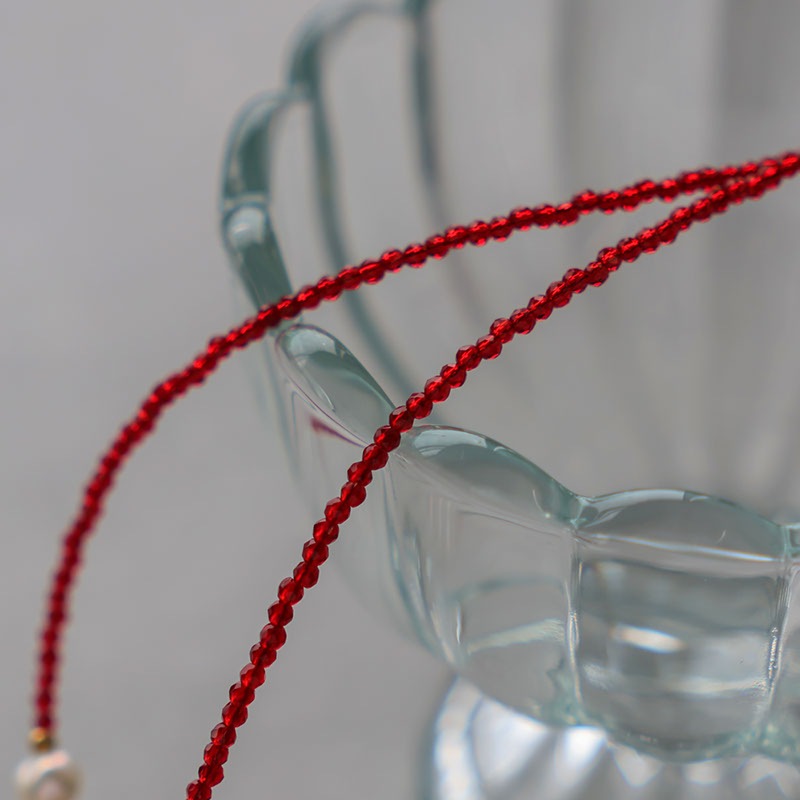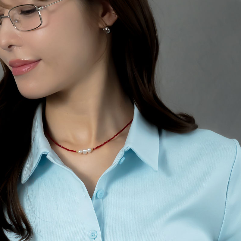 レッドカラーのカットビーズがデコルテラインに沿い、華奢ながらも目を引くデザインで重ね付けにもおすすめ。