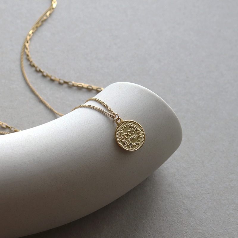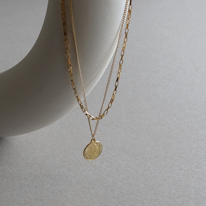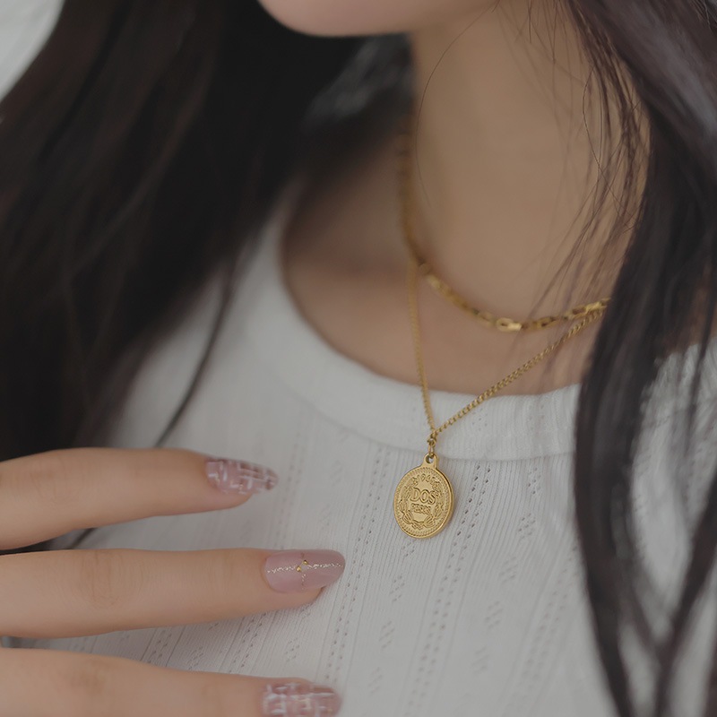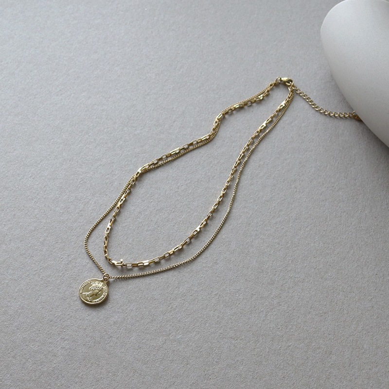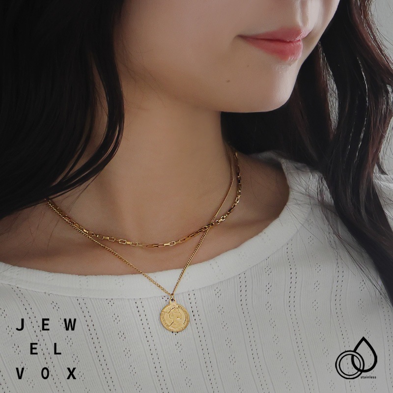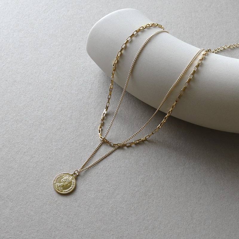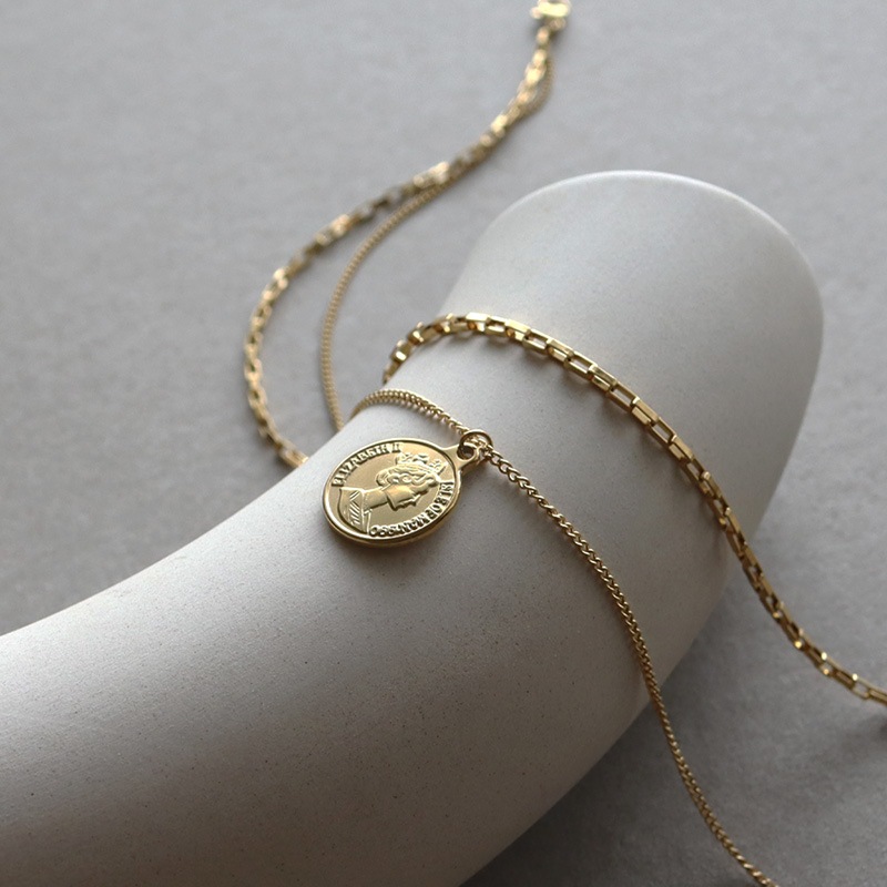 2種類の異なるチェーンを合わせ、トップにエリザベスコインをセットした2連デザイン。