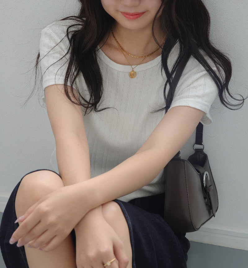 胸元に華やかさをプラスしてくれるゴールドの艶めきがコーデにアクセントを与えてくれます。