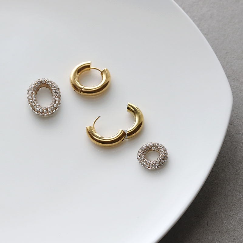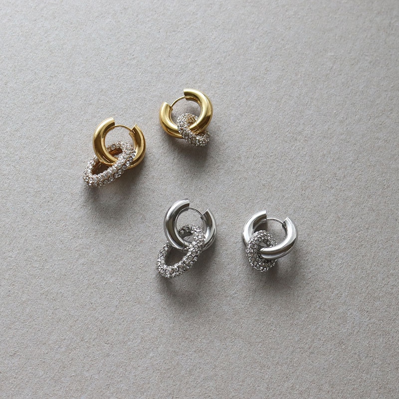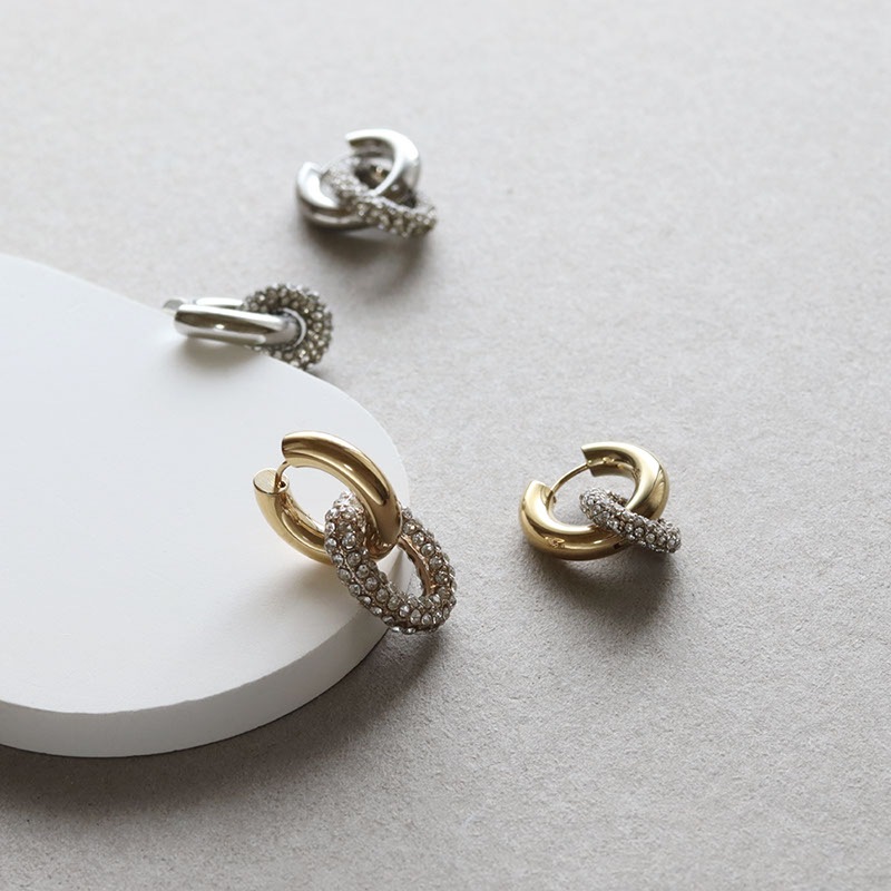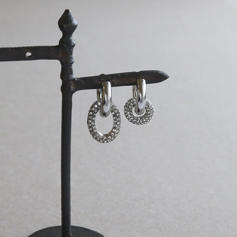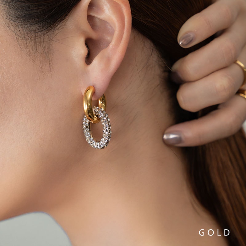ワンタッチで装着できるフープピアスに、煌めくラインストーンを敷き詰めたパヴェリングを組み合わせたボリューム感のあるデザイン。