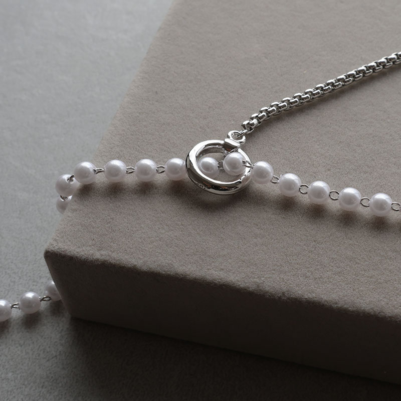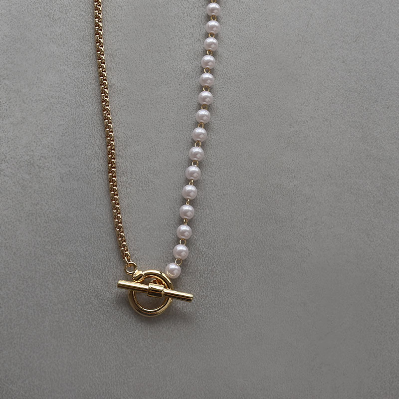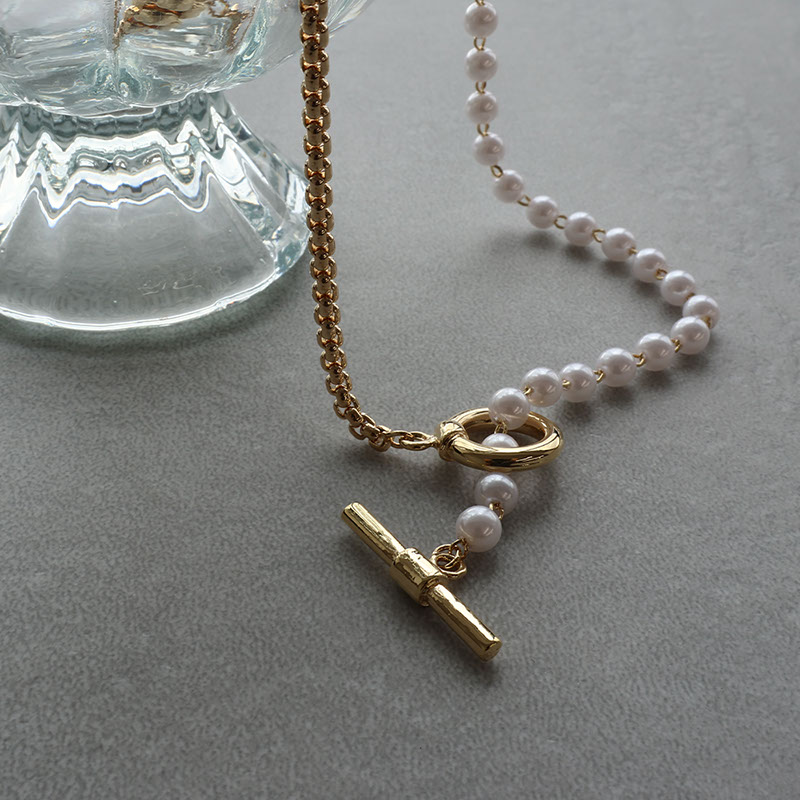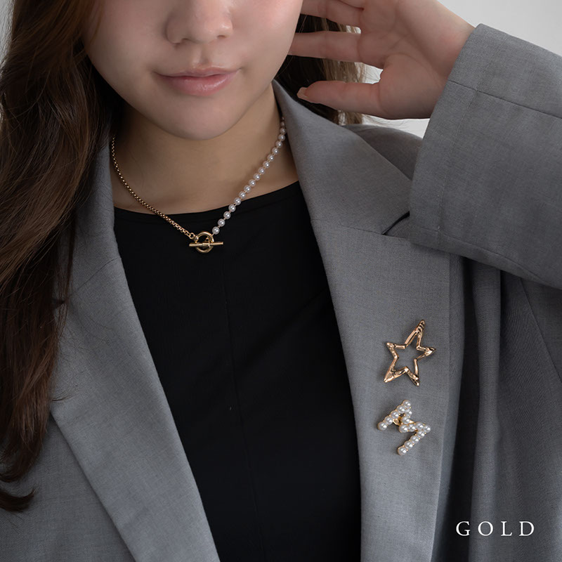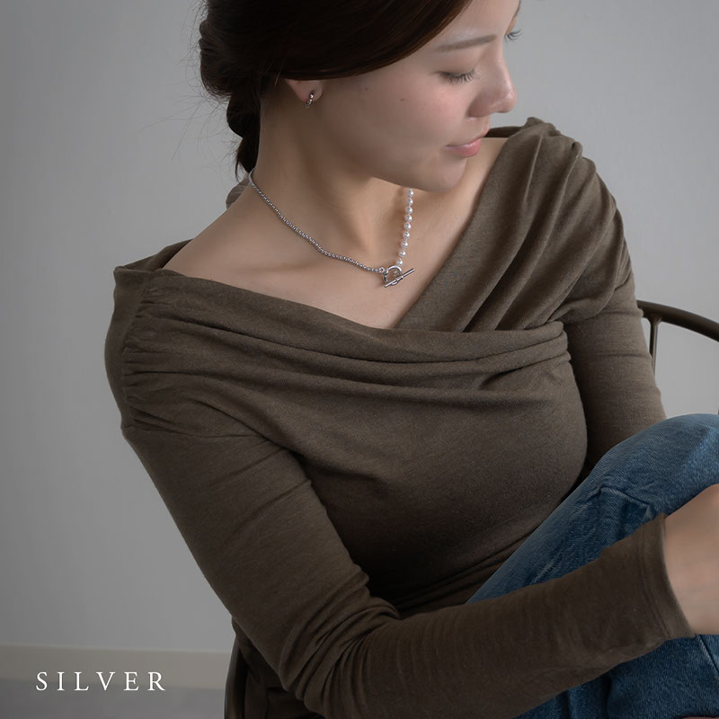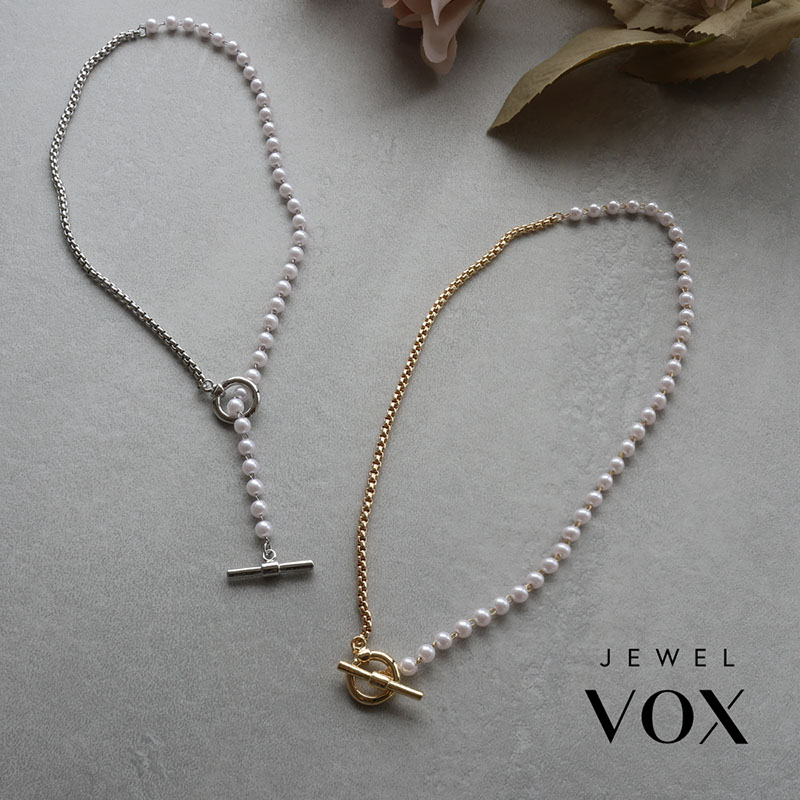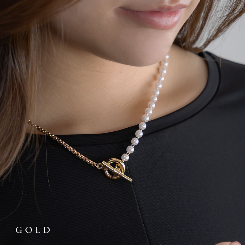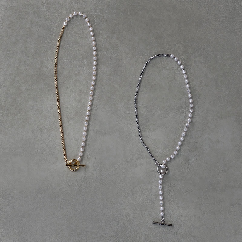 - 上品なパールと引き締まったチェーンが合わさったアシンメトリーデザインのネックレスです。