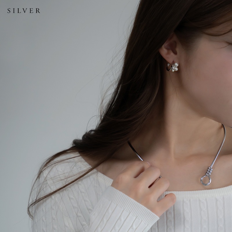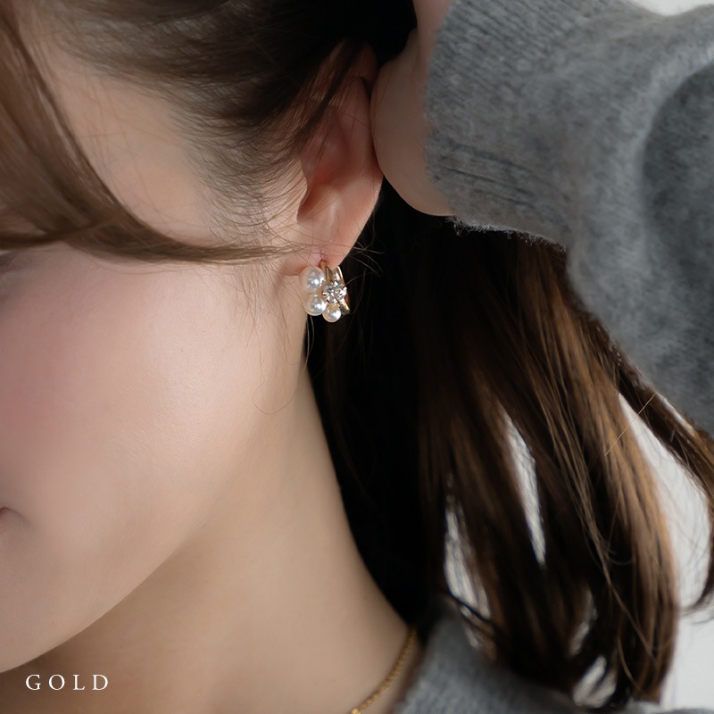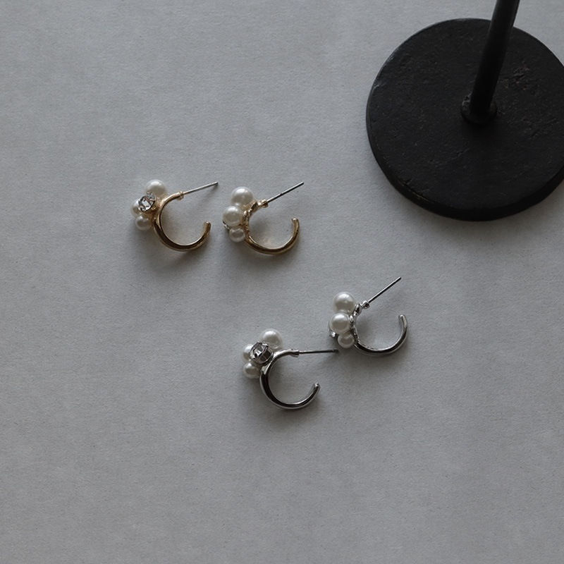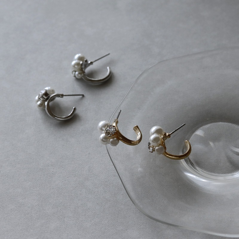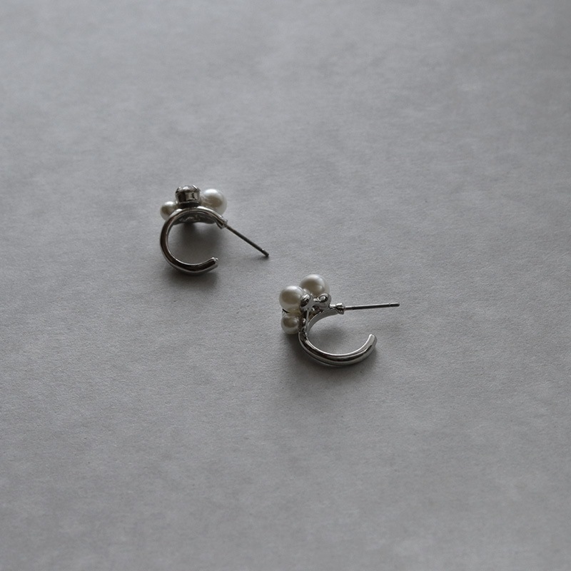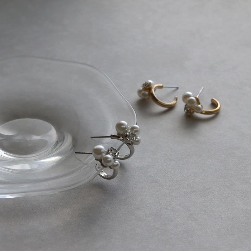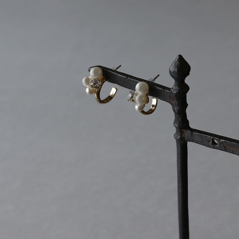 - 大きさの異なる3つのパールと、一粒のストーンが煌めくフープピアスです。