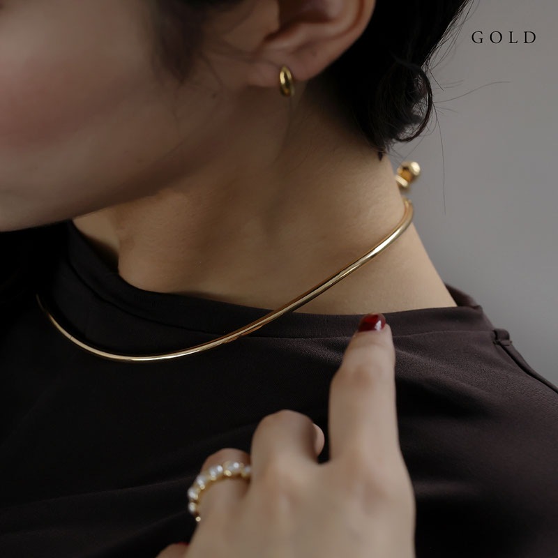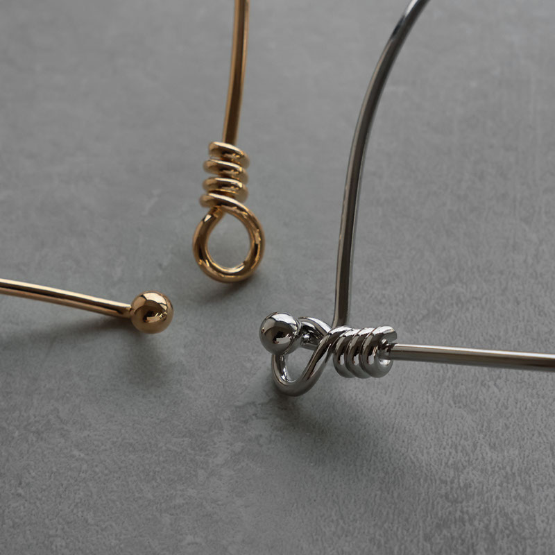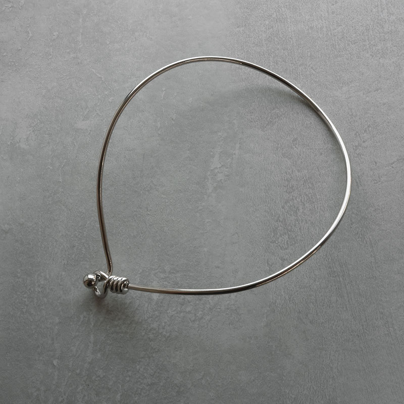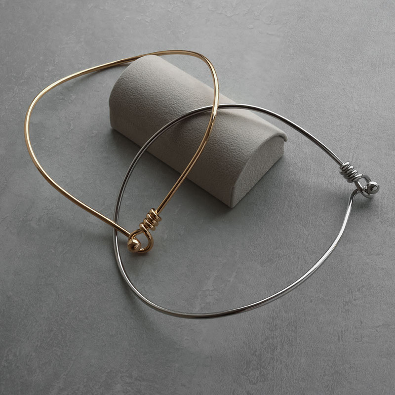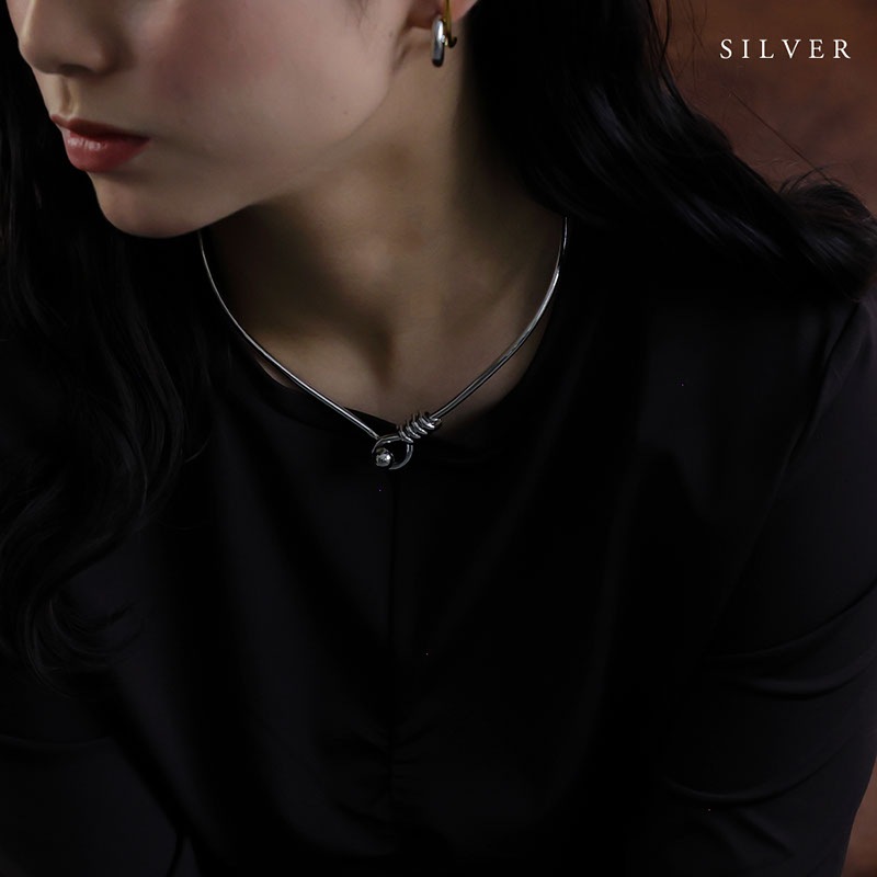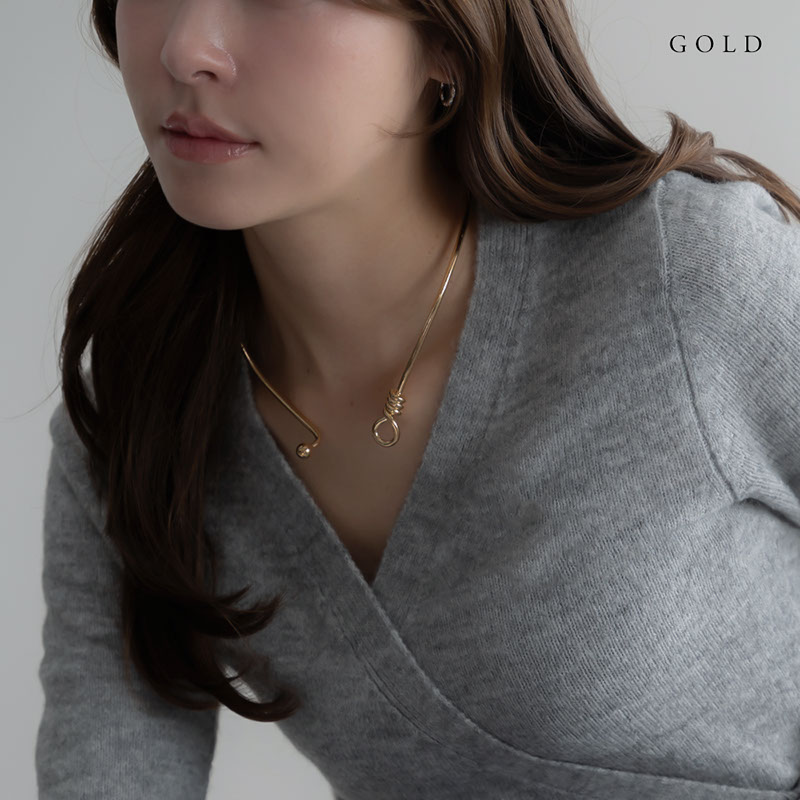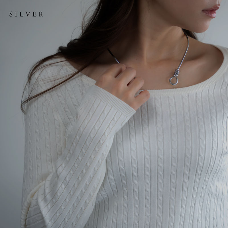 コイルを巻きつけたような留め具がポイントになったデザインで、デコルテのラインに沿うシルエットがスマートに決まります。