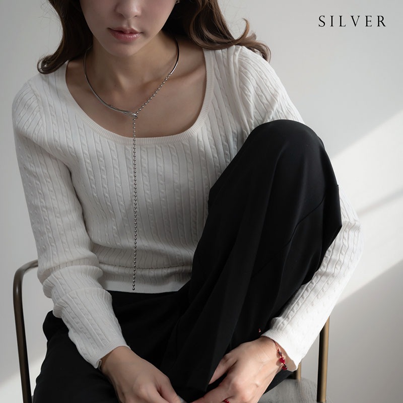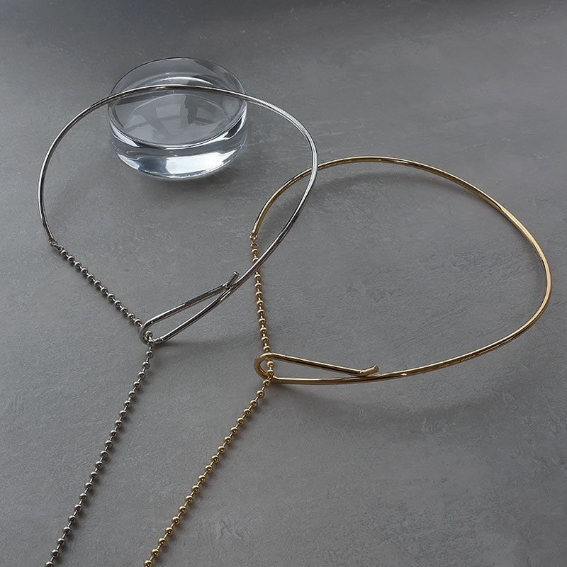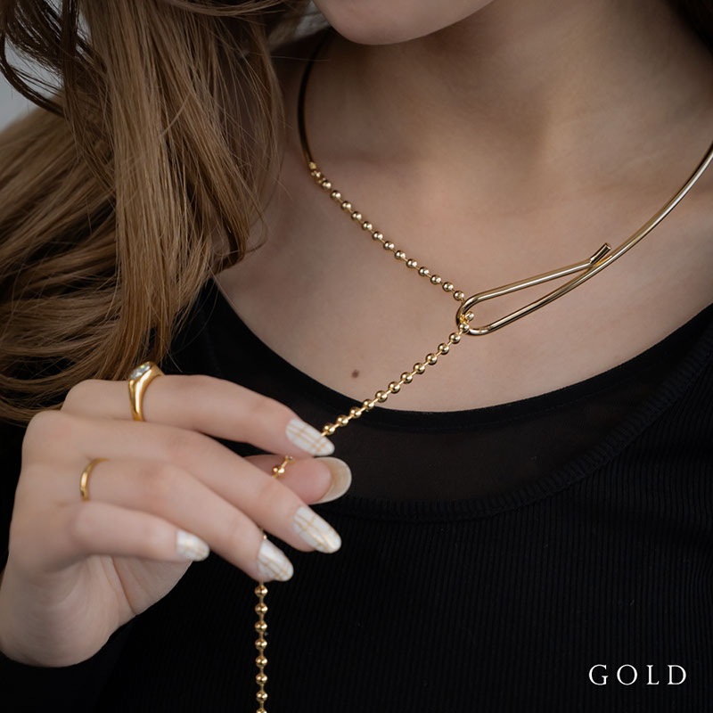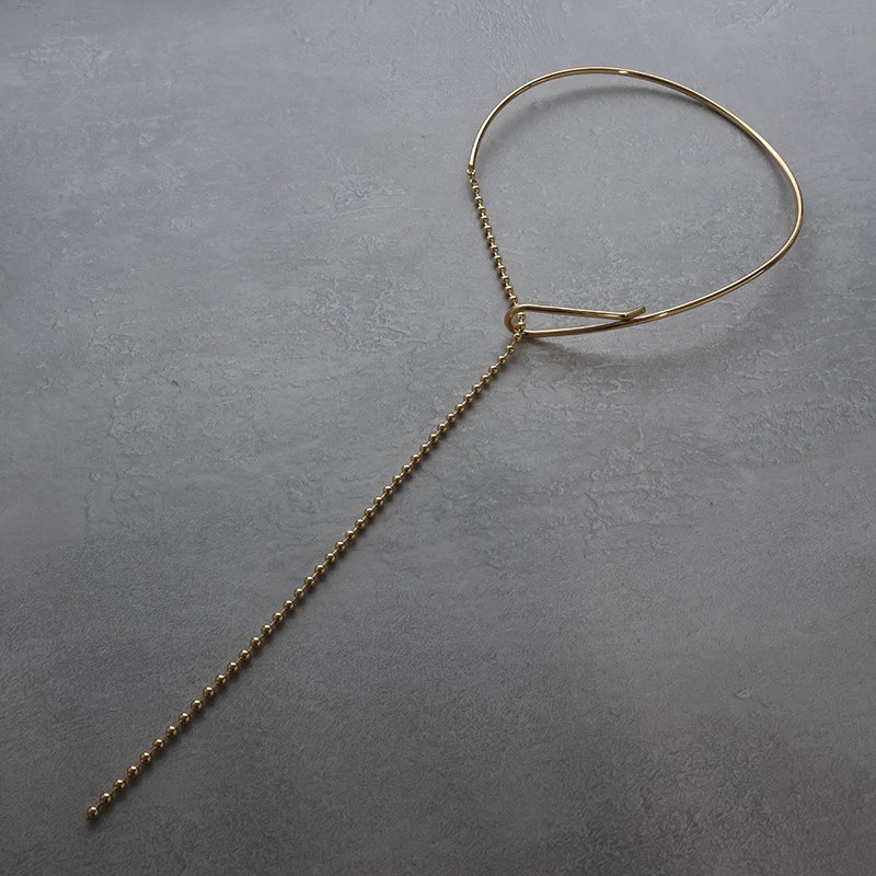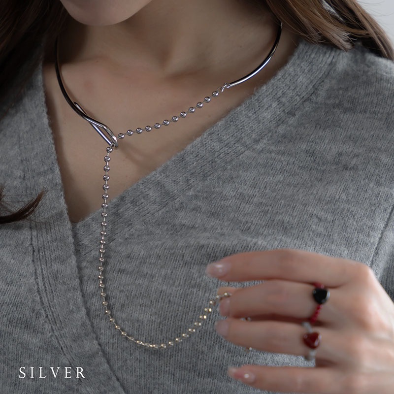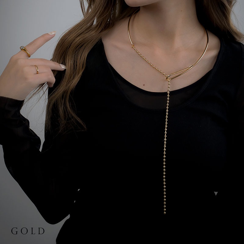 前方にあるチョーカーの結び目に、艶やかなボールチェーンを通して垂らすY字デザイン。