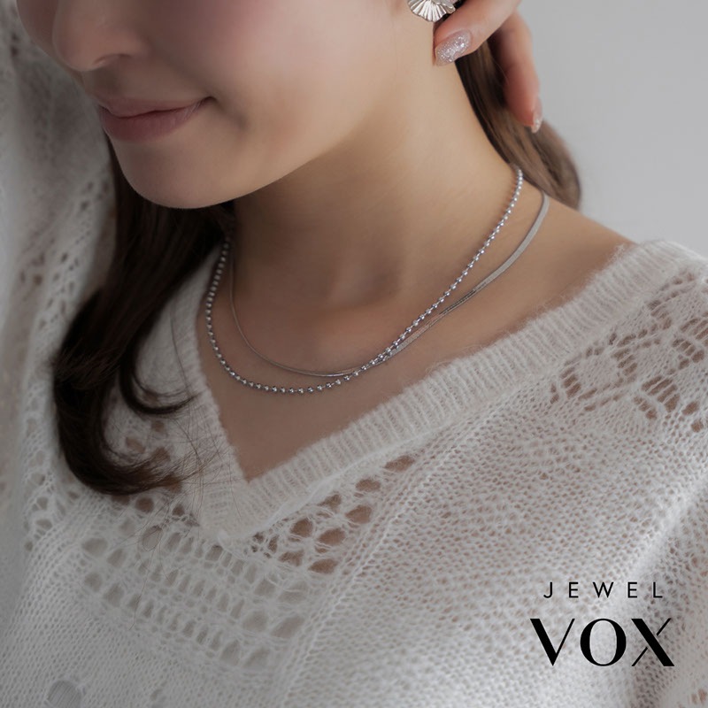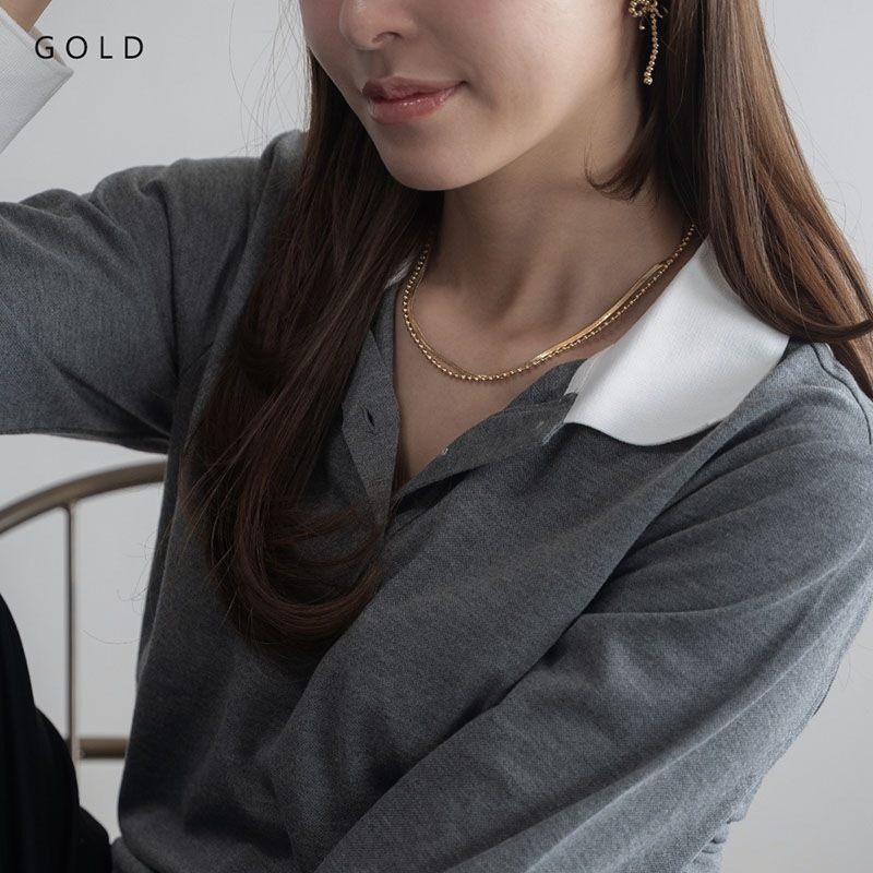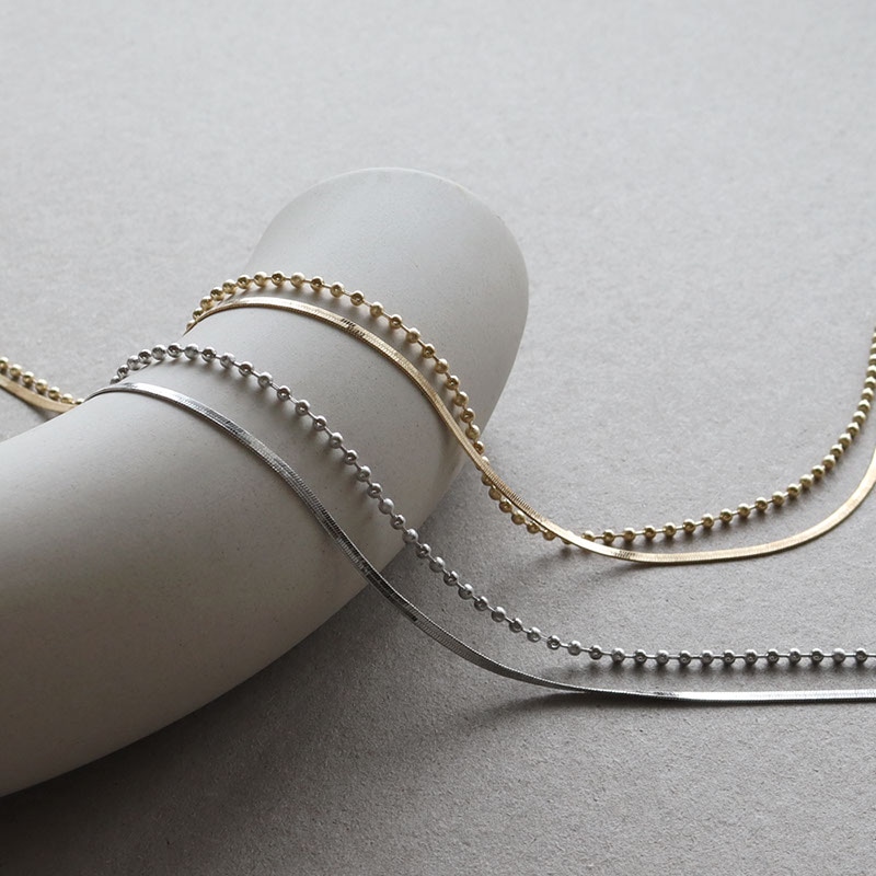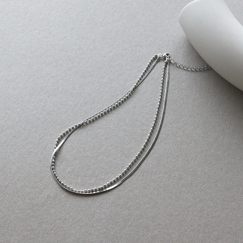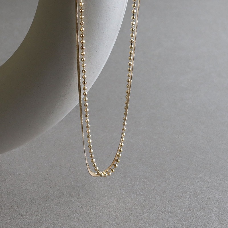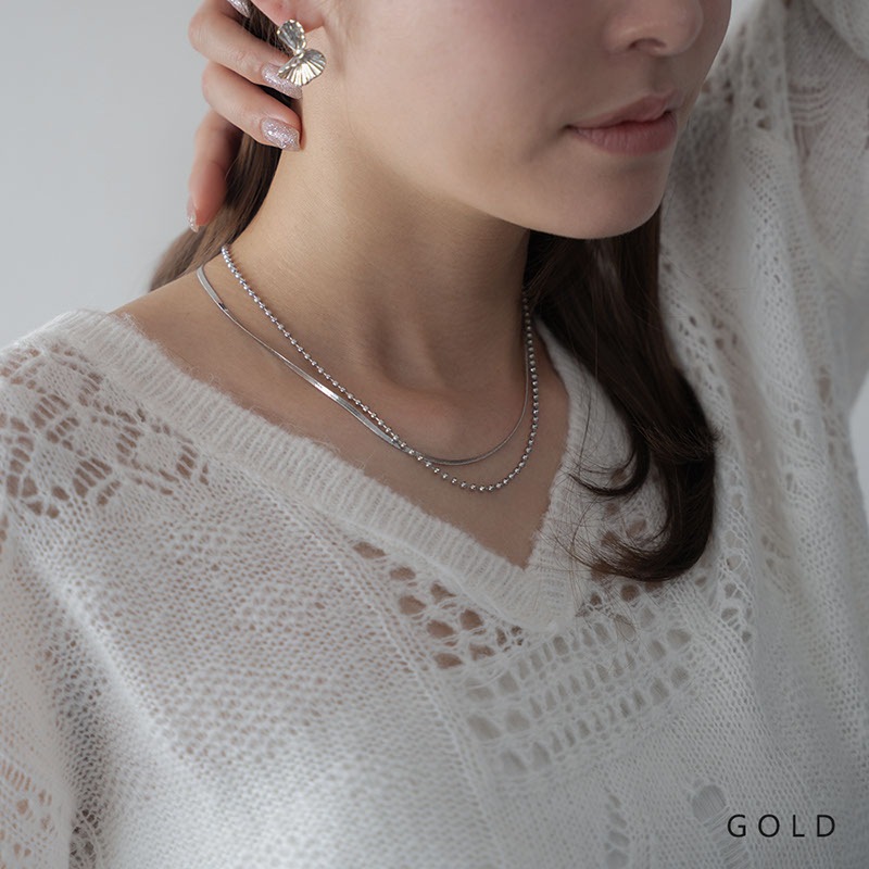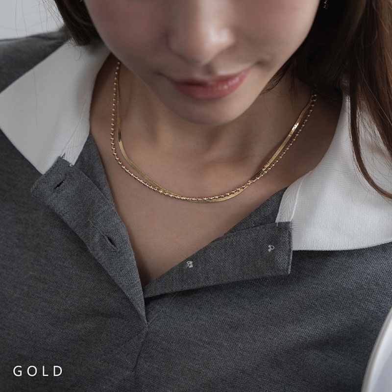 - なめらかな平スネークチェーンとボールチェーンが重なり合う2連ショートネックレスです。